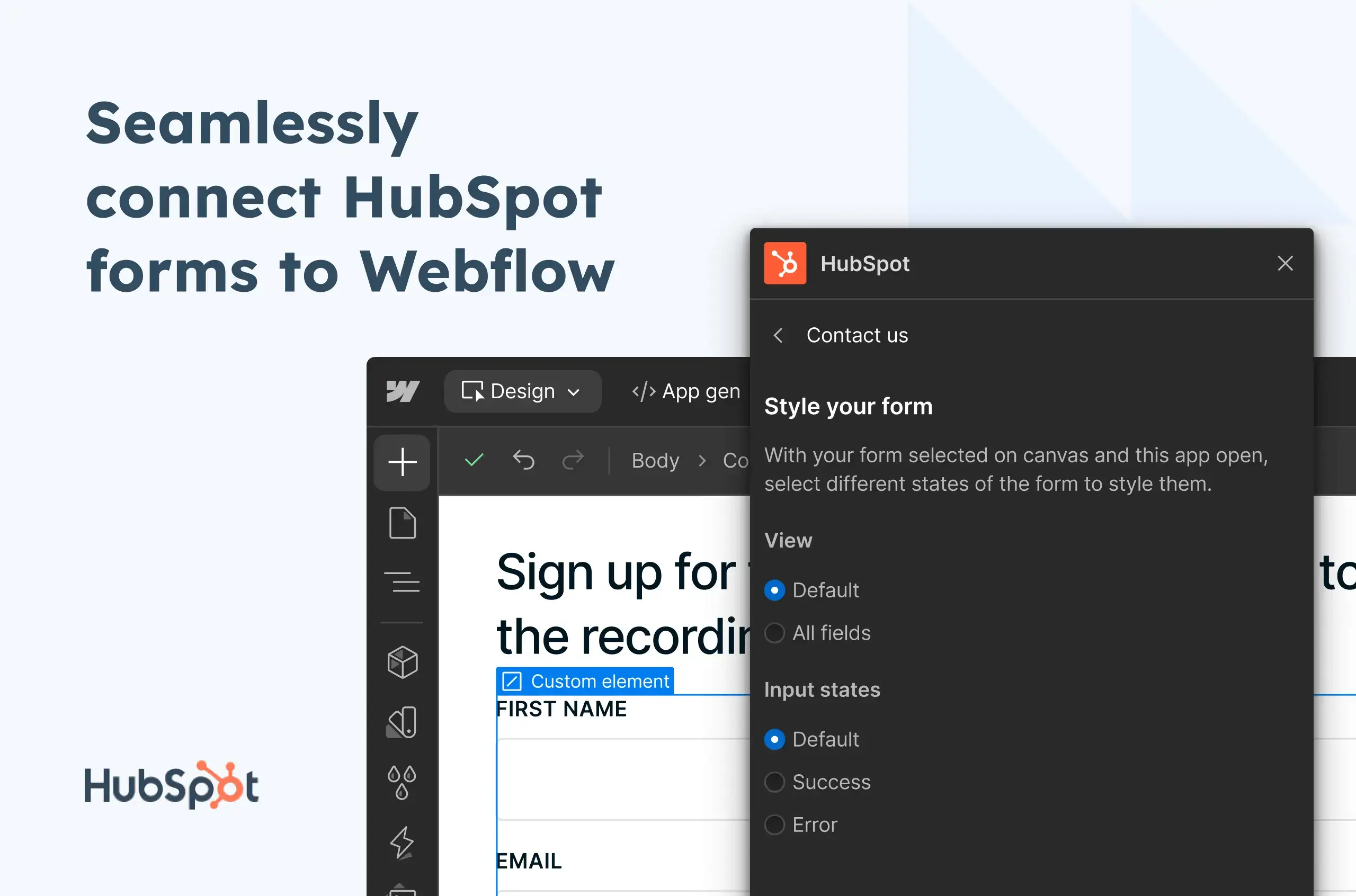 The new Webflow plugin by HubSpot brings smooth and visual form management. You can design, sync, and publish HubSpot forms without leaving the Webflow Designer - fully integrated and code-free. Connect Webflow forms to HubSpot, use HubSpots form options and preview in real time.